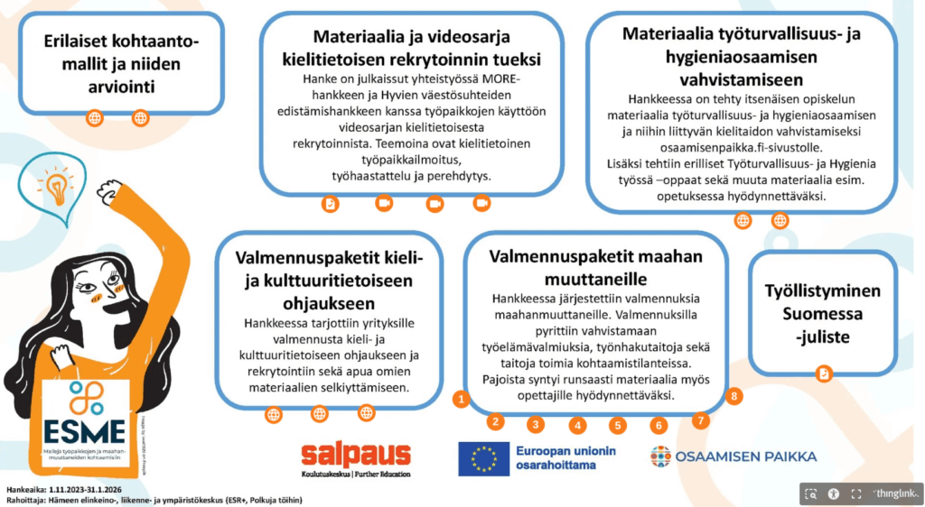 Ajalla 1.11.2023–31.1.2026 toiminut ESME – malleja työpaikkojen ja maahanmuuttaneiden kohtaamisiin -hanke (ESR+) etsi keinoja helpottaa työnantajien ja maahanmuuttajataustaisten työnhakijoiden kohtaamisia. Hankkeen painopiste oli konkreettisissa malleissa ja valmennuksissa, joilla vahvistettiin työnhakijoiden työelämä- ja työnhakuvalmiuksia sekä työyhteisöjen, rekrytoijien ja perehdyttäjien kieli- ja kulttuuritietoisuutta. Lisäksi hanke pilotoi erilaisia kohtaantomalleja ja arvioi niiden toimivuutta vieraskielisten kohderyhmälle.