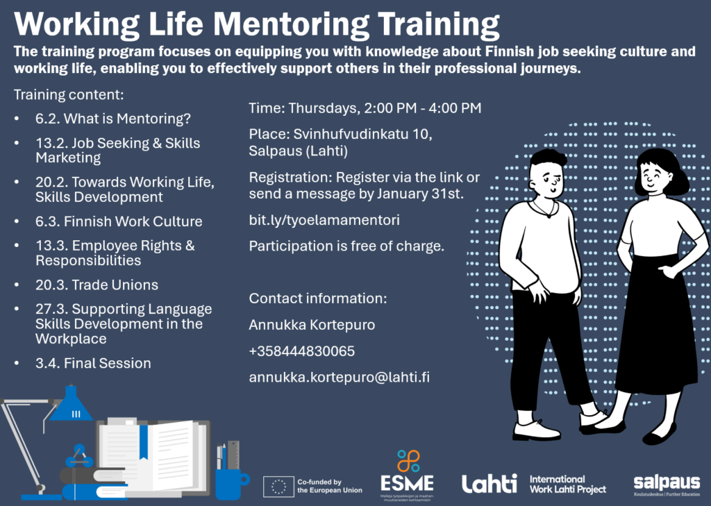 Työelämämentori-koulutus järjestettiin keväällä 2025. Koulutuksen järjestivät yhteistyössä Koulutuskeskus Salpauksen ESME-hanke (ESR+) ja International Work Lahti-hanke.