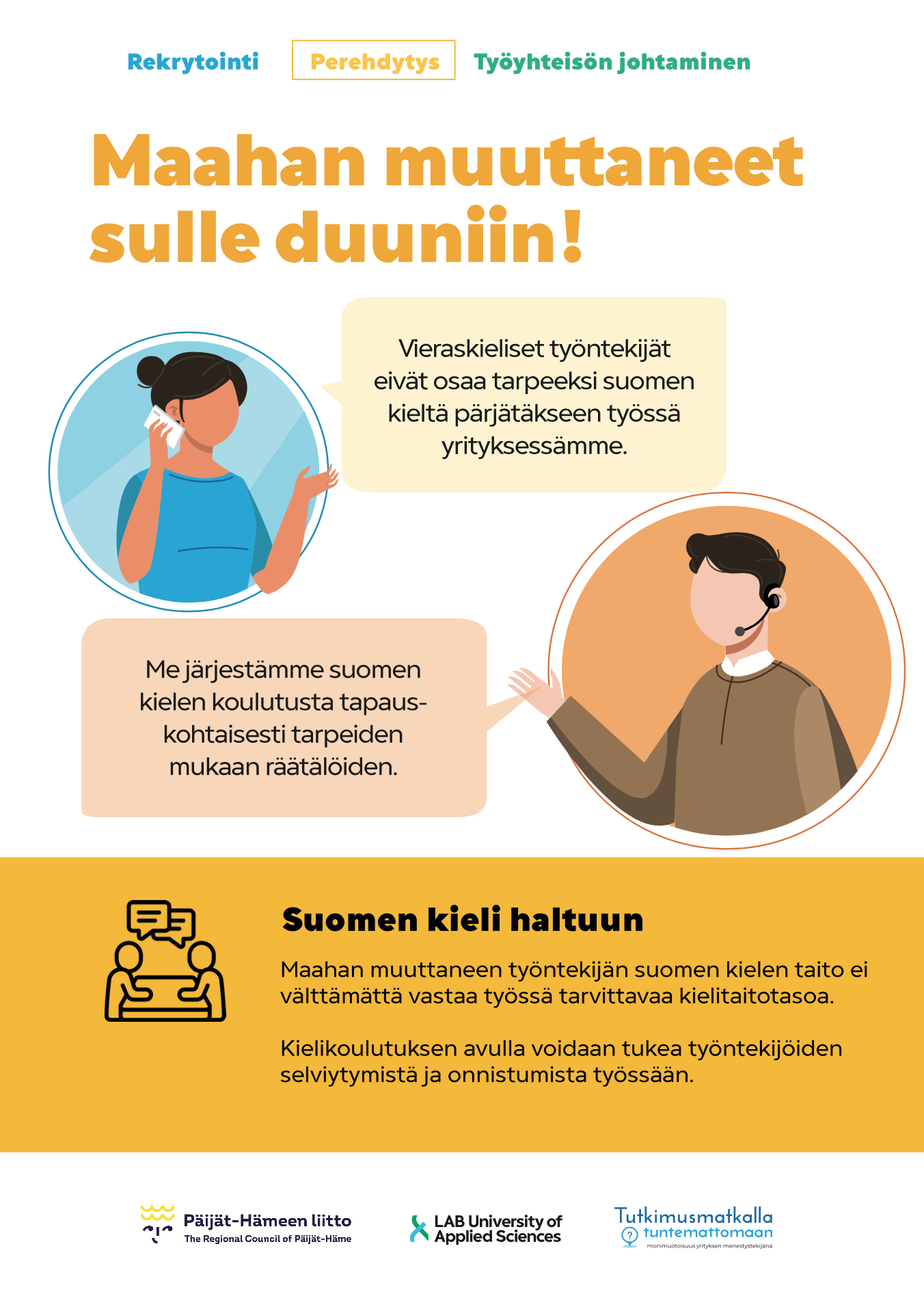 Tälle sivulle on koottu Tutkimusmatkalla tuntemattomaan -hankkeessa laadittuja materiaaleja, joiden tarkoituksena on tukea yritysten rekrytointi- ja perehdytysprosesseja sekä kulttuurisesti moninaisen työyhteisön rakentamista.